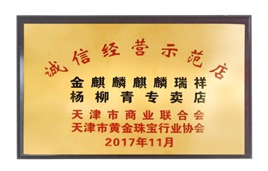 此次示范店评比是由市商务委、市商业联合会、市场监管委、市公安局、市物价检查局、市消协和黄金珠宝行业协会等7个部门对全行业进行评选,最终评选出5家诚信示范店。分别是天津金麒麟金饰有限公司西青店、天津金元宝中国黄金店、金梦园天津旗舰店、天津百信珠宝城、海天珠宝天津店、天津华龙珠宝金店。会上由市商联会会长韩秀云女士市商联会副会长市黄金珠宝行业协会会长钱进先生为获奖店面代表进行授牌并合影留念。本次的评选再次让天津市珠宝业诚信经营、诚信自律的工作再上新水平。